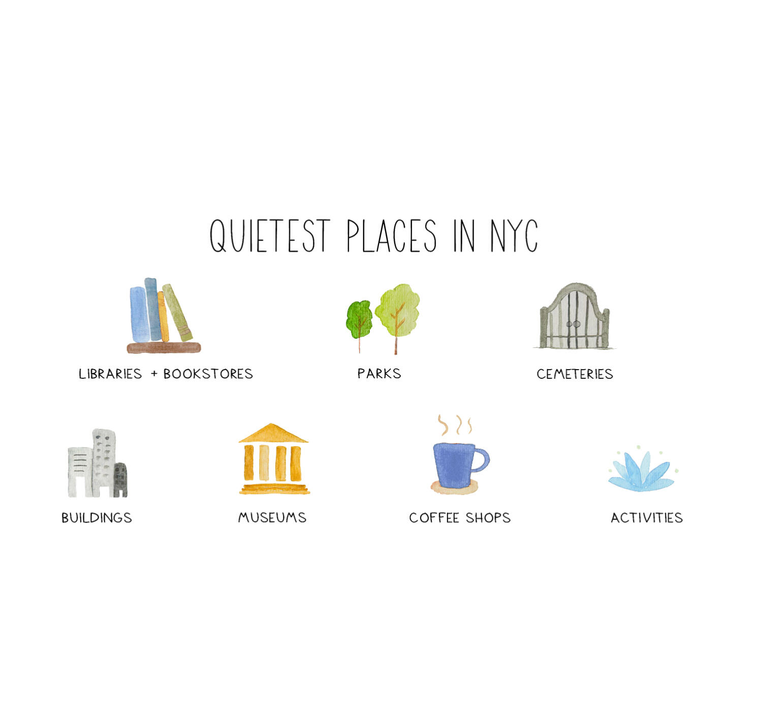 Quietest Places in New York City is a celebration of peaceful places. This beautifully illustrated book, featuring 55 watercolor paintings, is a charming and useful guide to finding calm in New York City. It uncovers hidden waterfall parks, secret cemeteries, cozy cafés, and quiet spaces for contemplation.See the original post that inspired the book.